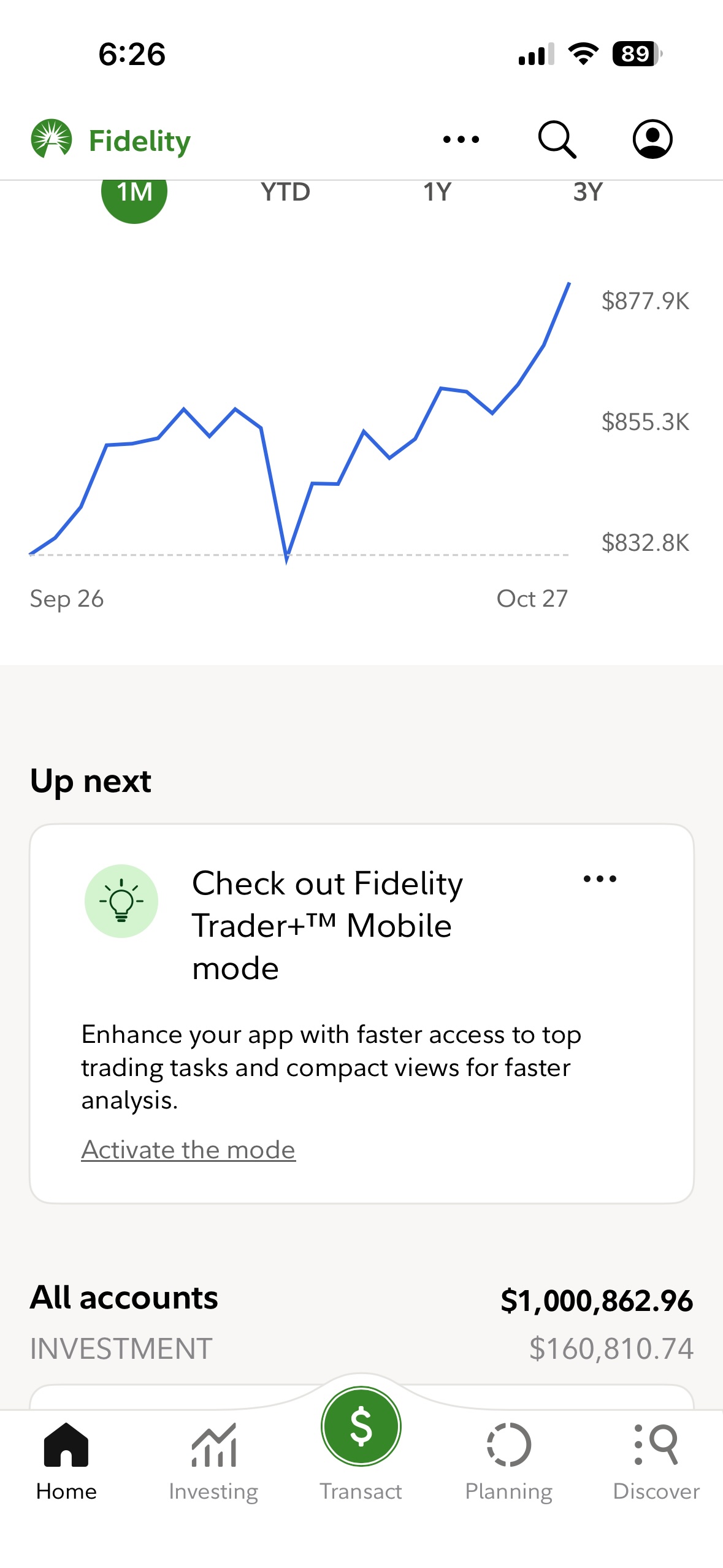 오늘 아침에 일어난 후 확인해 보니 Fidelity main 화면에 드디어 1M 달러가 찍혔다.