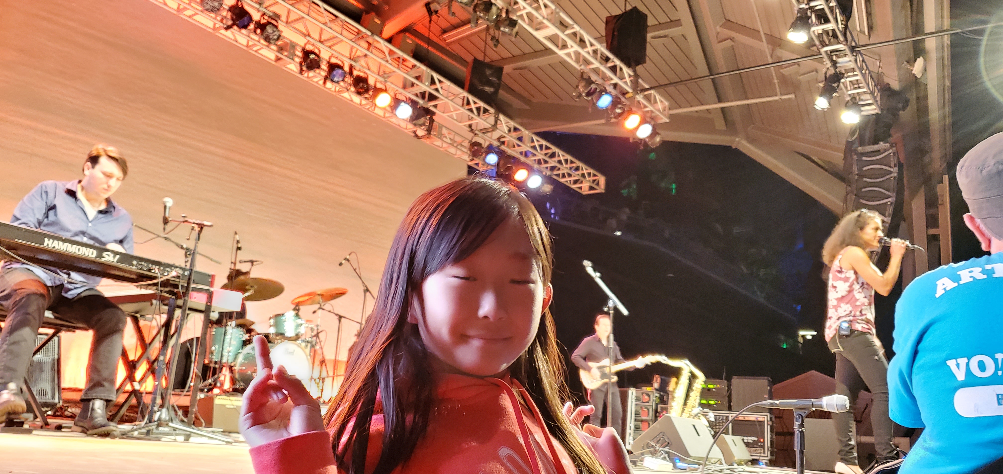 야외공연장에 왔더니 색소폰 연주자가 객석까지 내려와서 너무 신나게 공연을 한다.