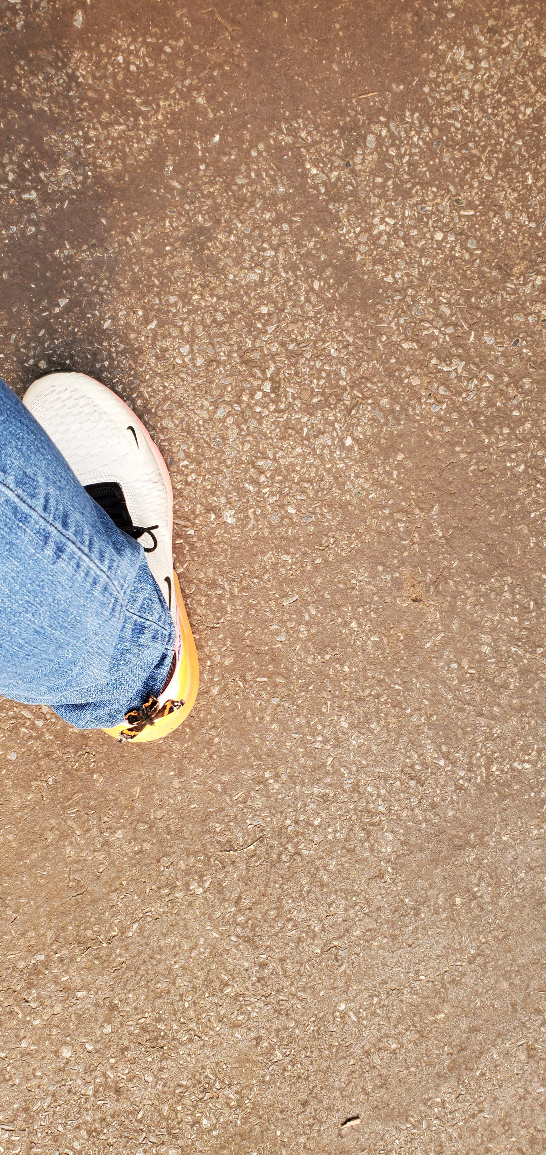 운동화 색깔이 형광색이라 꽃이랑 착각을 한 건가? :-)