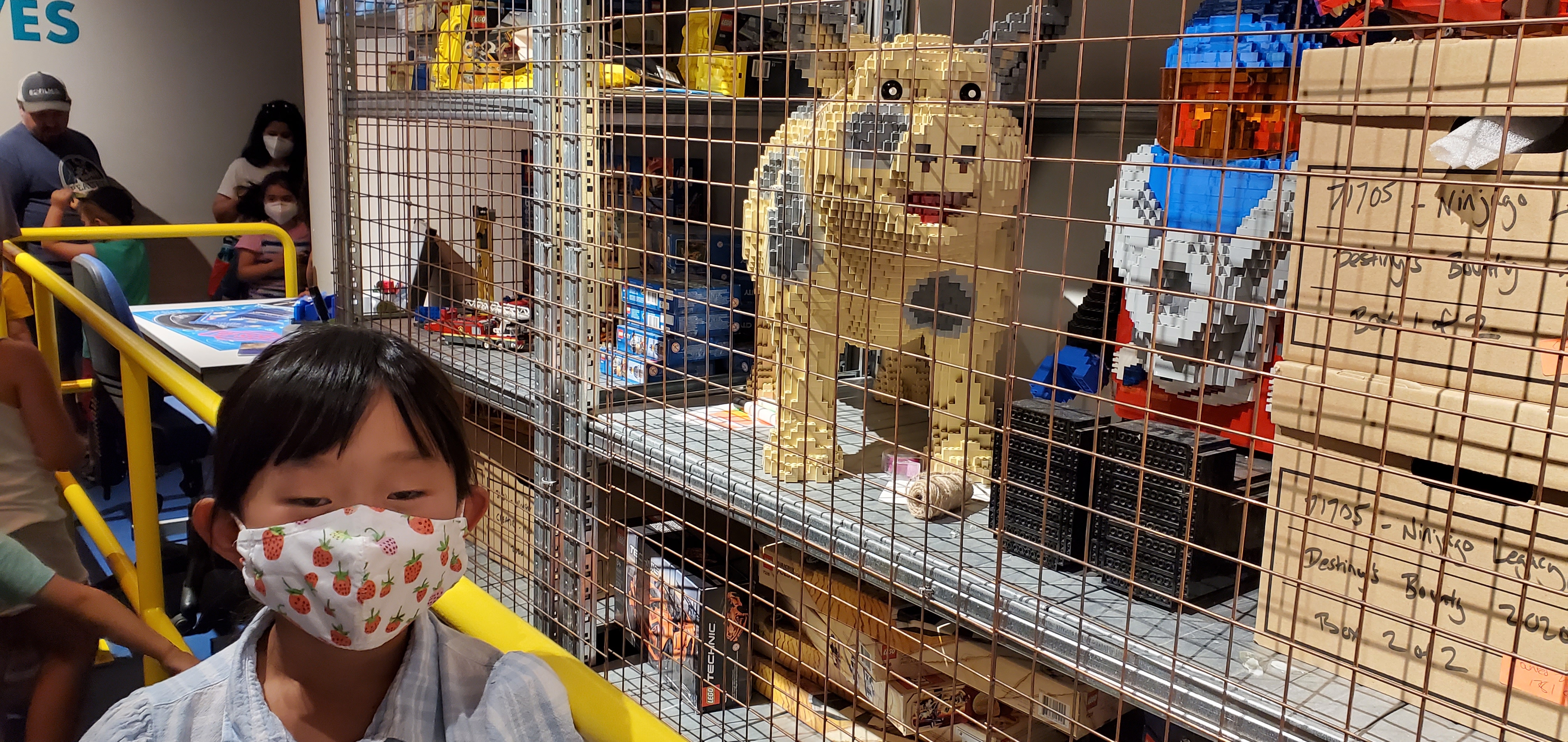 Bricktopia에 있는 Lego Factory Adventure Ride 대기 줄에 있는 Lego 모형들..