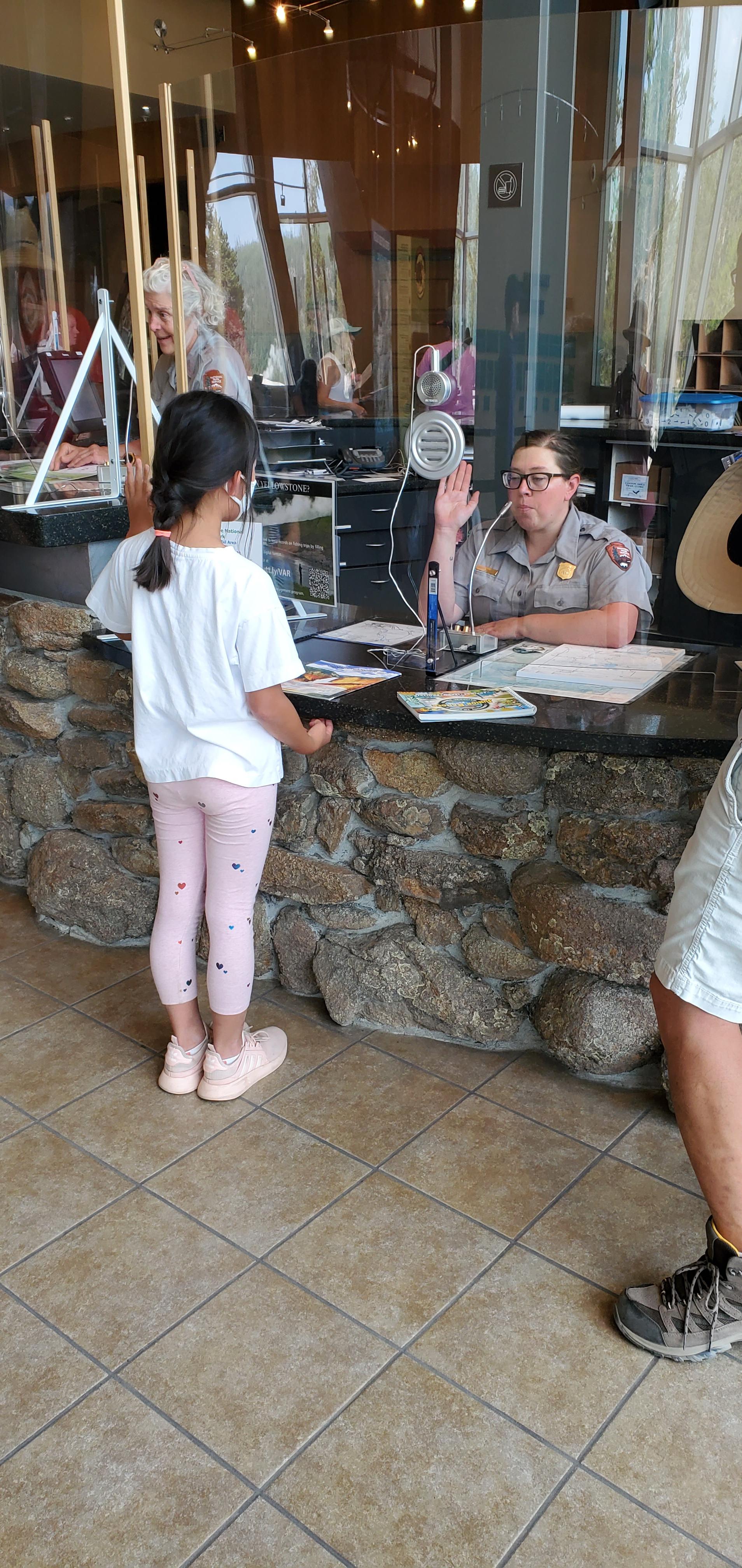 Upper Geyser Basin에서 돌아오고 난 후 마침 율이가 Junior Ranger Challenge를 끝내서 Visitor Center에서 Junior Ranger 선서를 했다.