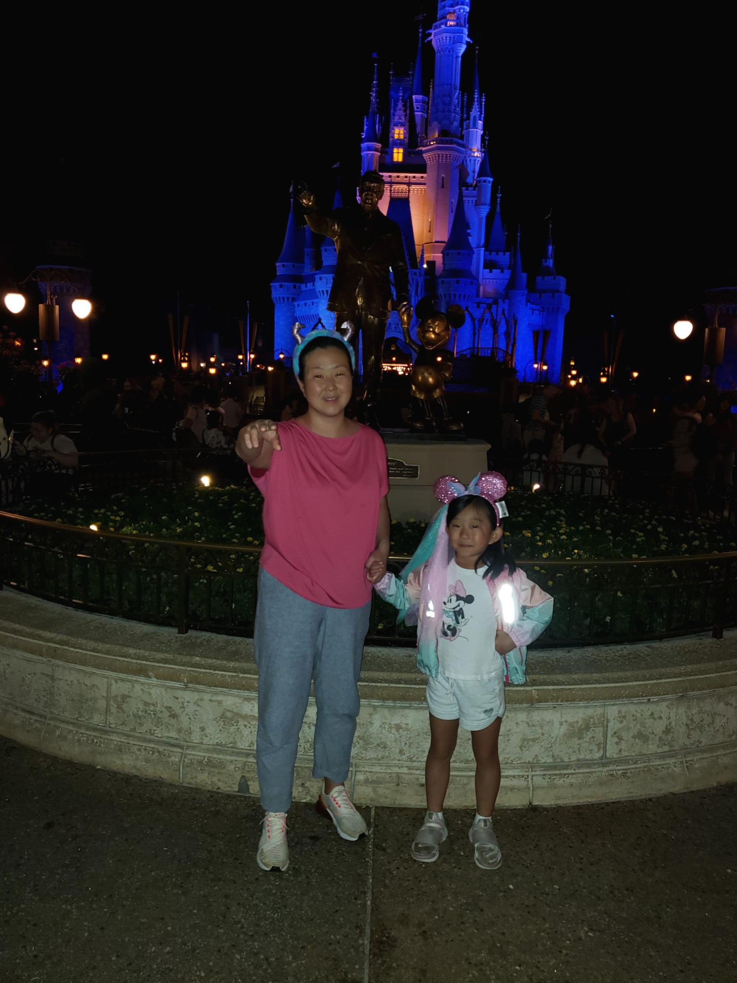 신데렐라 성 앞에.. 미키 손을 잡고 있는 월트 디즈니 동상을 따라 하는 집사람과 율이... 낮에 찍었어햐 했는데.. :-(